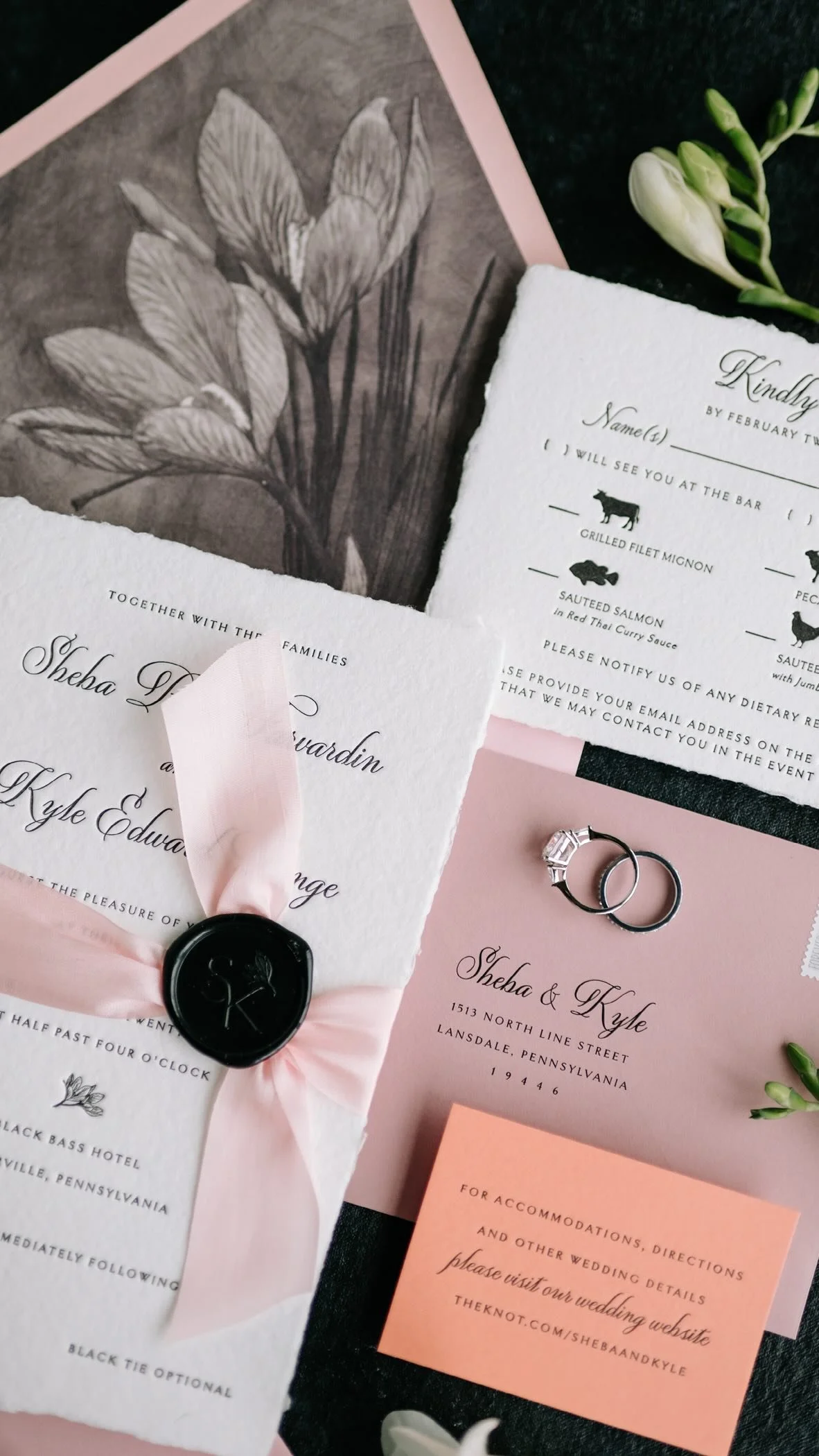 These averages include invitations, envelopes, and enclosures, with many couples choosing to add embellishments like liners, ribbons, or wax seals. Full-service clients also enjoy concierge options such as addressing, assembly, and mailing — so every piece arrives as beautifully as it was imagined.