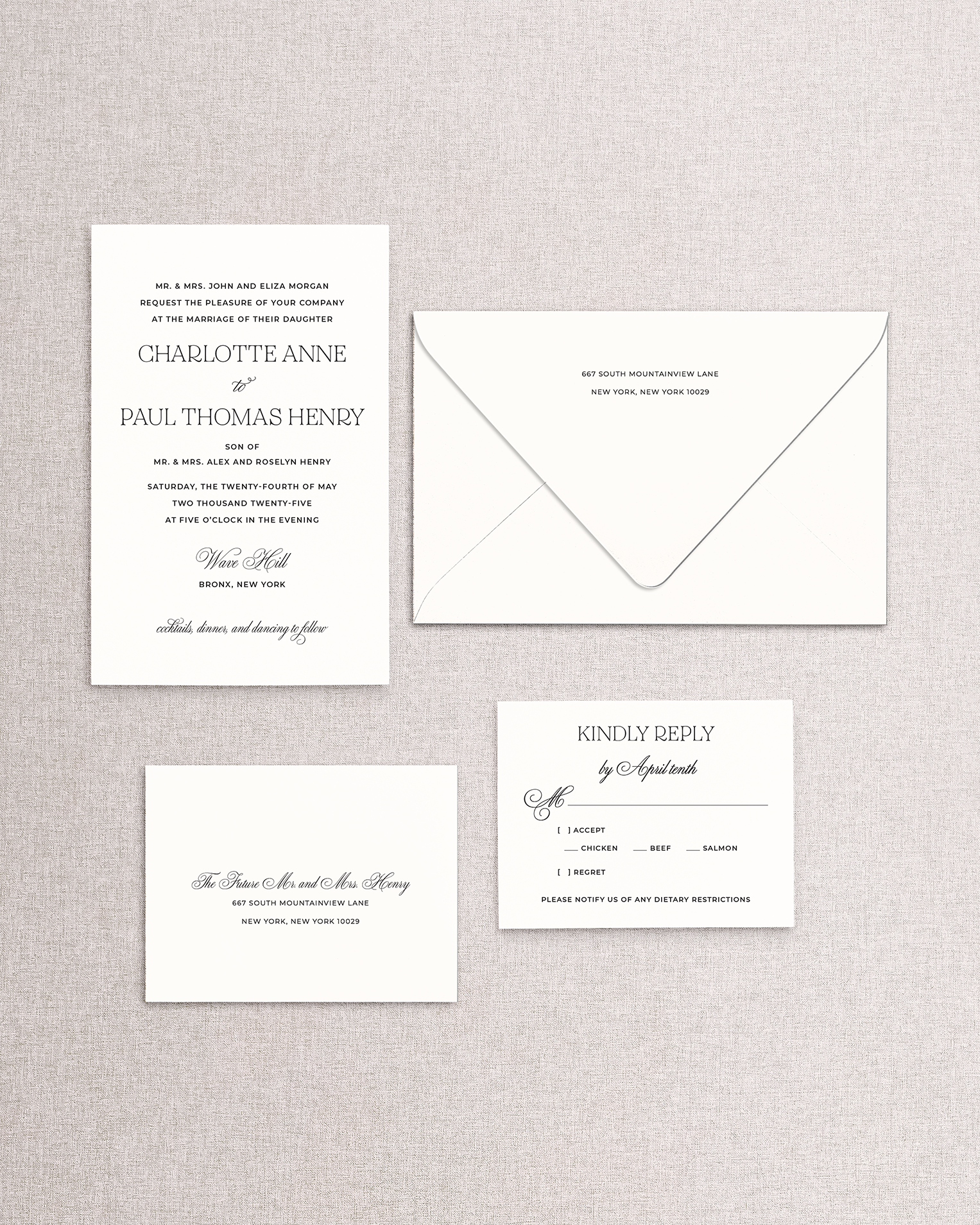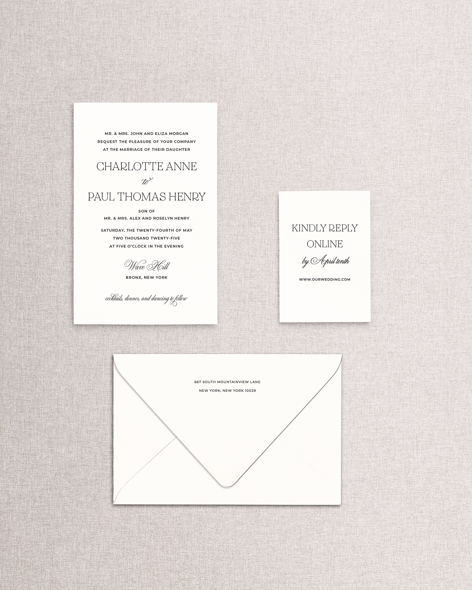 Additional pieces, like a rehearsal dinner or welcome party invitation, weekend itinerary, and more, can be added later.